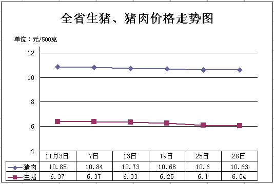 (一)猪肉价格小幅下降。供应上,养殖企业为冲年度目标提前出栏生猪,二次育肥大猪集中上市,再加上进口猪肉和冻肉库存充足,市场猪肉供过于求。需求端偏弱,11月禽肉等替代品价格较低分流了部分猪肉消费,餐饮和家庭采购不多,消化不了过剩供应,猪肉价格随之小幅下降。11月28日,生猪(每500克,下同)平均价格6.04元,月环比下降5.18%,同比下降28.01%;猪肉(去骨后腿肉)10.63元,月环比下降2.03%,同比下降18.79%。