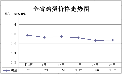 (二)鸡蛋价格小幅下降。供应上,蛋鸡存栏量仍处于近五年高位,老鸡淘汰进度慢,还有冷库蛋库存较多,市场鸡蛋供应充足。需求端正处于淡季,食品厂备货和家庭采购需求减少,餐饮采购量不足,消化不了过剩供应,导致鸡蛋价格小幅下跌。11月28日,鸡蛋平均价格3.67元,月环比下降2.65%,同比下降26.31%。