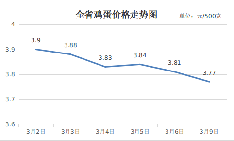 二、鸡蛋价格小幅下降。当前鸡蛋市场供应较为宽松,周中在元宵节、工厂学校开工开学集中采购增加等因素带动下,鸡蛋价格短暂提升,但上涨动力不足,鸡蛋价格小幅下降。3月9日,鸡蛋全省平均价格3.77元,周环比下降3.33%,同比下降10.45%。