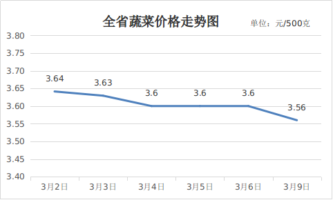 三、蔬菜价格小幅下降。节后蔬菜价格提振作用消失,市场陆续恢复正常交易,整体购销均衡,同时南方蔬菜开始进入上市期,蔬菜供应量增加,带动价格小幅下降。3月9日,重点监测的16种蔬菜全省平均价格为3.56元,周环比下降2.2%,同比上涨16.96%。