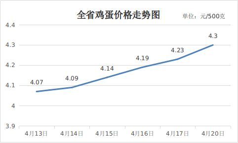 二、鸡蛋价格小幅上涨。需求端:商家开始为中小学生春假和“五一”假期提前备货,学校工厂、餐饮等集中采购逐步恢复带动销售;供给端:今年以来饲料及原料价格上涨提升养殖成本,推动鸡蛋价格上涨。4月20日,鸡蛋平均价格4.3元,周环比上涨5.65%,同比上涨3.86%。