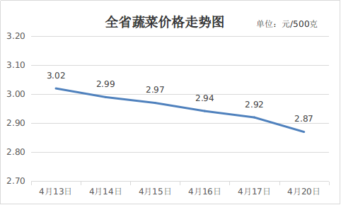 三、蔬菜价格小幅下降。本周气温明显升高,蔬菜生产条件便利,省内棚菜进入丰产期,叠加南方蔬菜集中上市,市场整体供应量充足,蔬菜价格整体呈现小幅下降走势。4月20日,重点监测的16种蔬菜平均价格为2.87元,周环比下降4.99%,同比下降0.52%。