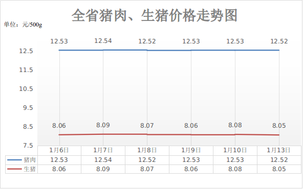 (二)生猪、猪肉价格微幅下降。当前猪肉市场供应充足,价格呈微幅震荡下行走势。1月13日生猪、猪肉价格分别为8.05元、12.52元,较上周一下降0.12%、0.08%,同比上涨14.51%、16.9%。