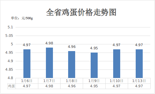 (三)鸡蛋价格持平。鸡蛋市场供需总体较为平衡,价格平稳。1月13日鸡蛋价格4.97元,与上周一持平,同比上涨3.76%。