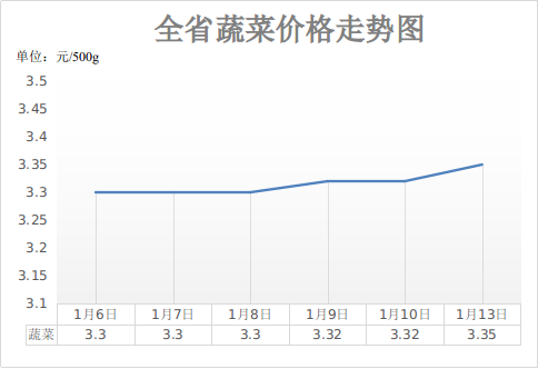 (四)蔬菜价格小幅上涨。近期气温偏低,蔬菜生产和运输成本增加,蔬菜价格季节性小幅上涨。重点监测的16种蔬菜10涨4降2平,平均价格为3.35元,较上周一上涨1.52%,同比下降9.95%。