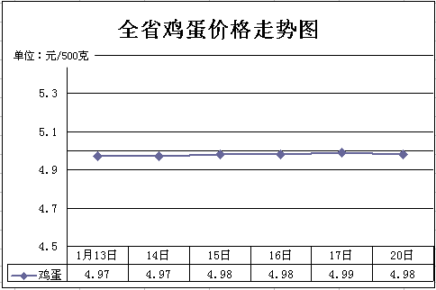 (四)鸡蛋价格微幅上涨。近期蛋鸡的产蛋率没有出现大的波动,鸡蛋产量保持稳定,虽然春节临近,鸡蛋需求有所增加,但增加的幅度相对有限,未对价格产生明显的拉动作用。供需平稳,市场价格微幅上涨。本周鸡蛋价格4.98元,较上周一上涨0.2%,同比上涨4.62%。